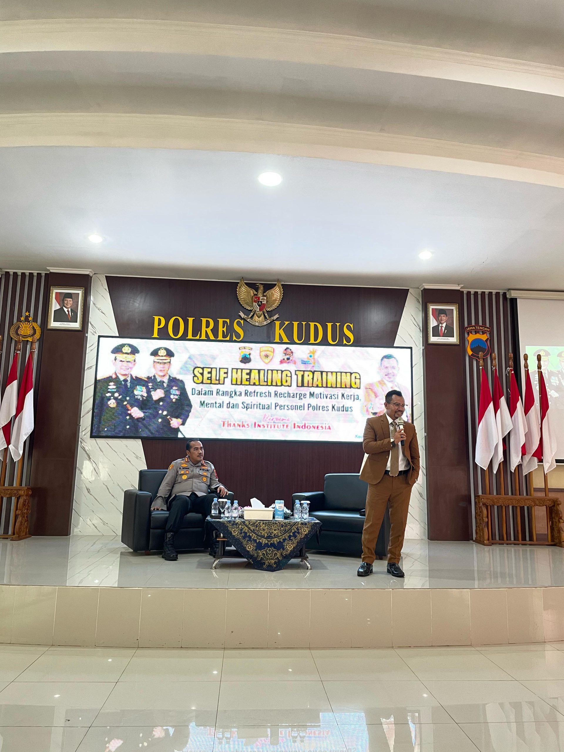 Acara yang digelar di aula Parama Satwika Mapolres Kudus menghadirkan narasumber Dr Ketut Abid Halimi SPdI M Pd CHt CPs selaku Direktur Thanks Institute Indonesia.