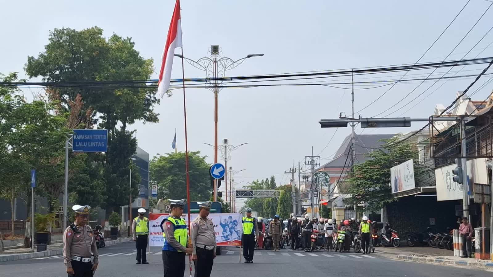 Setelah menunjukkan pukul 08.15, ratusan kendaraan mulai diberhentikan petugas gabungan dari TNI/Polri, Dishub dan Satpol PP Kota Mojokerto. Sedangkan Lalu lintas di empat ruas jalan untuk sementara waktu ditutup dengan spanduk yang dibentangkan.