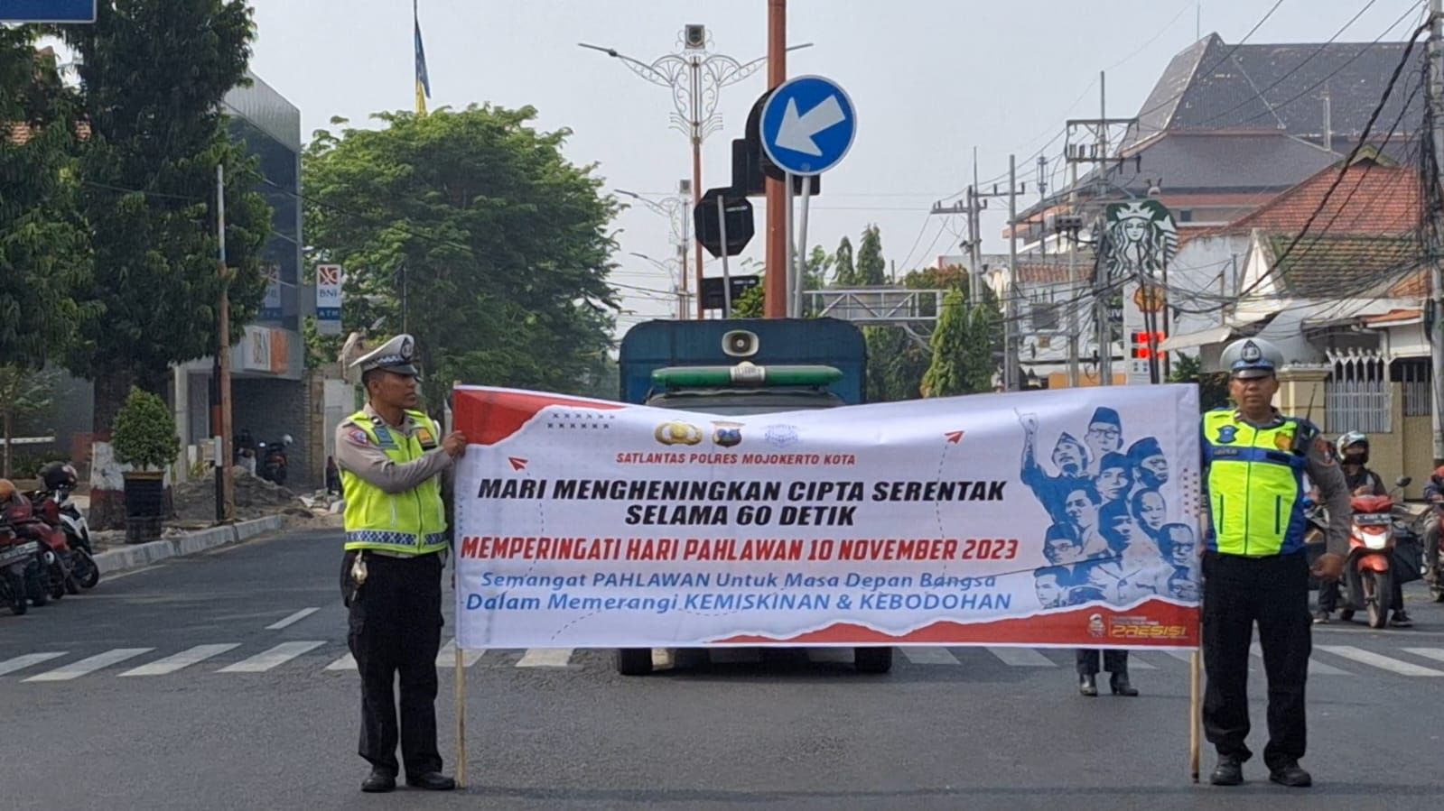 (Mabes Media, Mojokerto Kota) Petugas kepolisian dari Polresta Mojokerto, TNI dan Dinas Perhubungan Kota Mojokerto mengajak pengguna jalan untuk untuk mengheningkan cipta dalam rangka memperingati Hari Pahlawan di Simpang Empat Empu Nala, Jumat (10/11/2023).