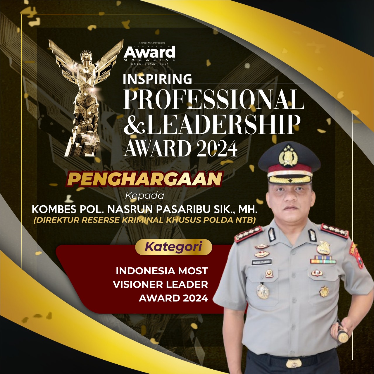 Dengan tugas tersebut Direktur Reserse Kriminal Khusus Polda Nusa Tenggara Barat yakni Komisaris Besar Polisi Nasrun Pasaribu, S.I.K., M.H berhasil menjadi pemimpin yang baik dengan dibuktikan diberikannya penghargaan bergengsi level asia “Inspiring Profesional And Leadership Award 2024” dari Indonesia Award Magazine di Hotel Aston Priority Simatupang, Jakarta Selatan pada Jum’at, (31/5/24)